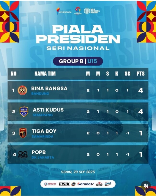 Di Grup B, Bina Bangsa (Bandung) dan Asti Kudus (Semarang) tampil impresif dengan sama-sama mengoleksi empat poin dari dua laga.